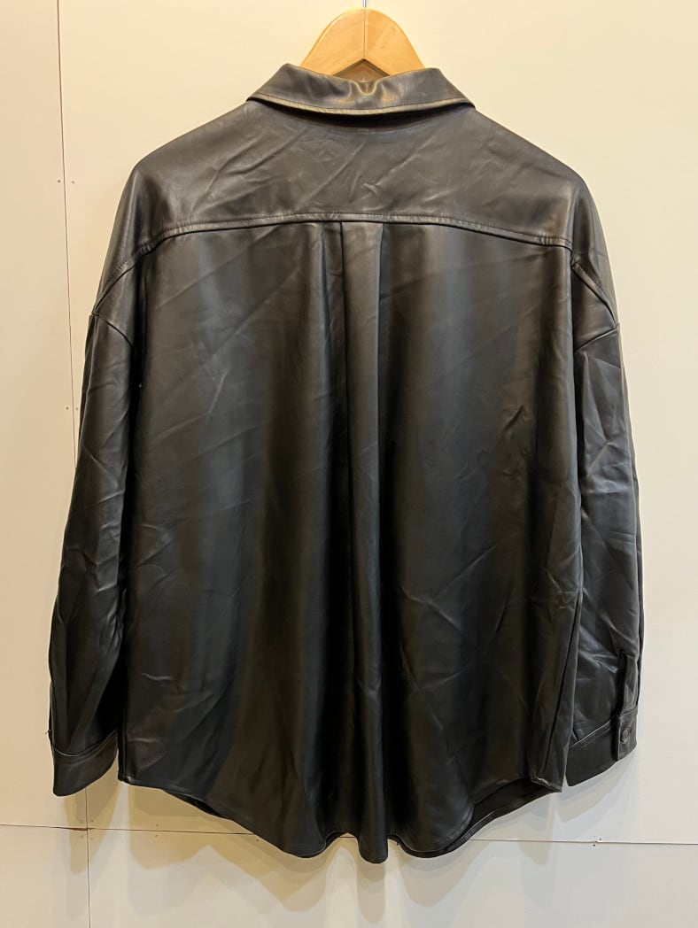 フェイクレザー素材のシャツ。ゆったりとしたシルエットでアウターとしても着用できます。